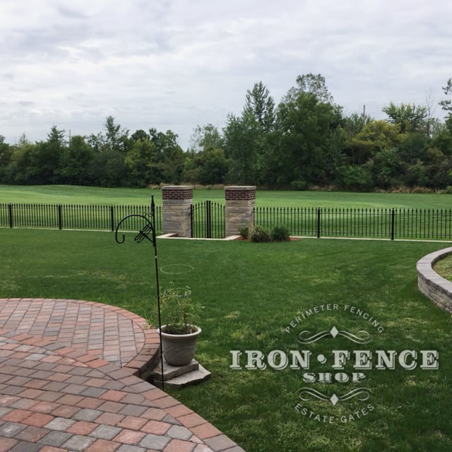 3ft Tall Signature Iron Fence Panels with Custom Gate Installed on a Brick and Stone Wall Top