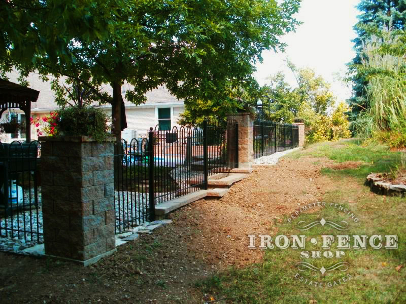4ft Tall Wrought Iron Hoop and Picket style fence stepped for yard grade