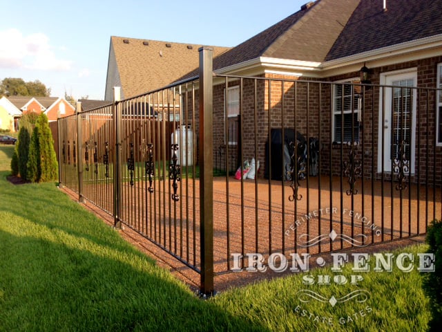 Our Puppy Picket iron fence has shorter 18" pickets at the bottom of the fence panel between the normal full-length pickets, along with welded quad flair finials on both. This is a popular design feature from wrought iron fences of yesteryear that we capitalize on to create a functional fence for pets. With just 1.69" spacing, you can rest easily, knowing that even the smallest dog will be safe on your property.